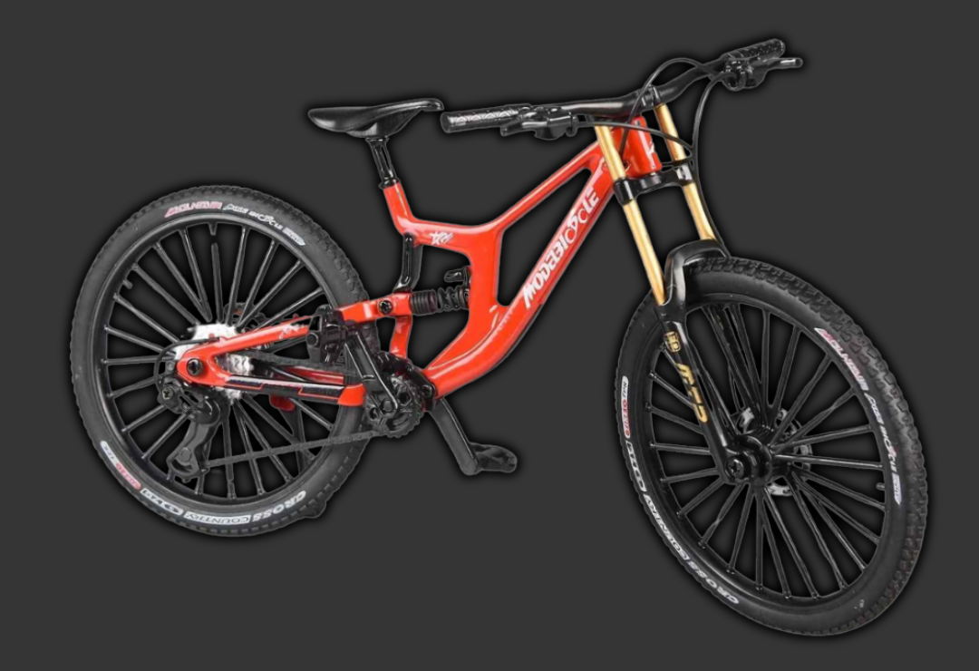 Depending on the model you choose, it includes a miniature downhill, enduro, mountain bike, or road bike, featuring realistic details and moving parts such as suspension and transmission.
